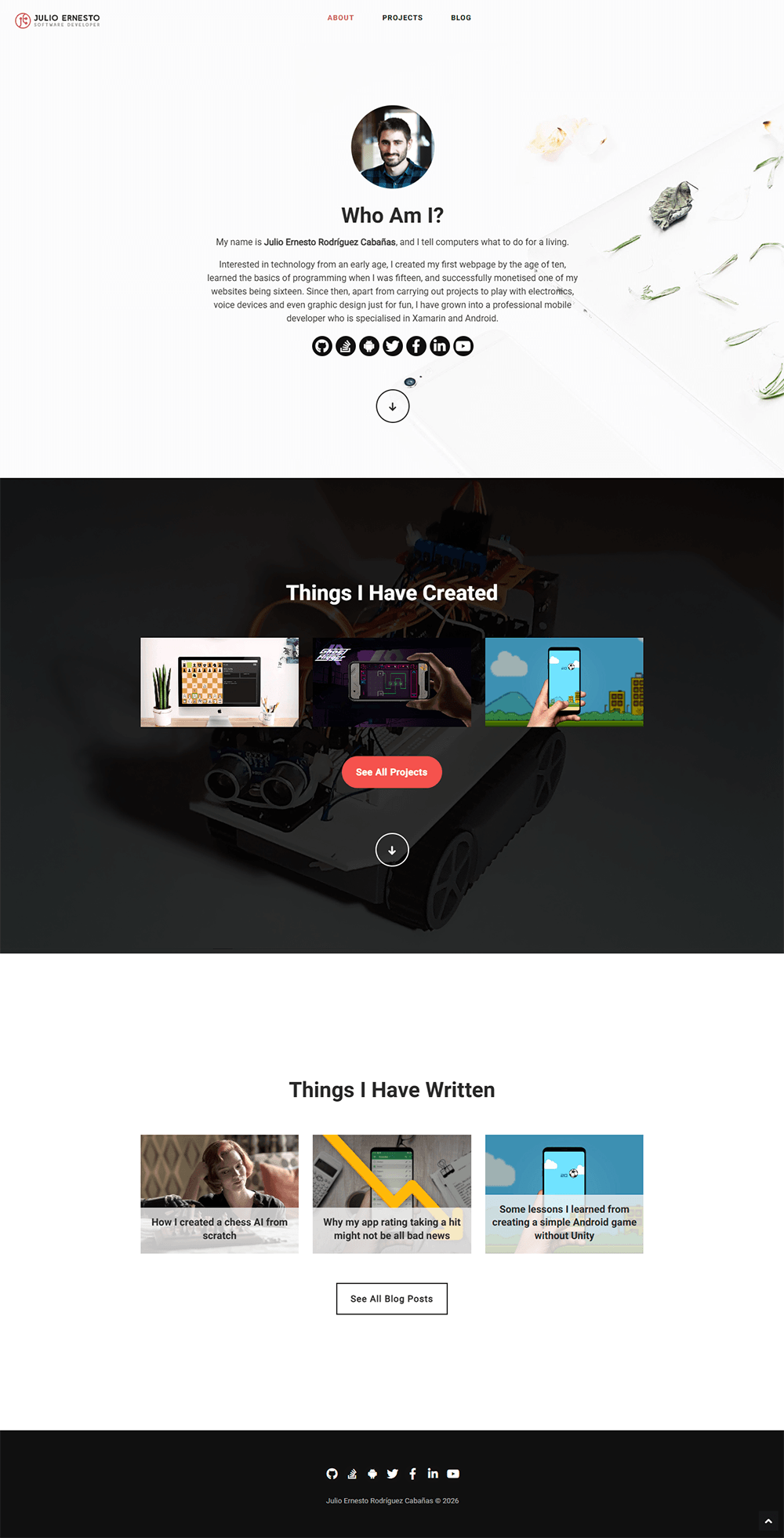 This was the first version of my personal website. The content wasn't so different from what you see here now, but I also had a blog, where I wrote bangers such as Why My App Rating Taking a Hit Might Not Be All Bad News and Is Xamarin Forms a Bug? (spoiler alert: it was).