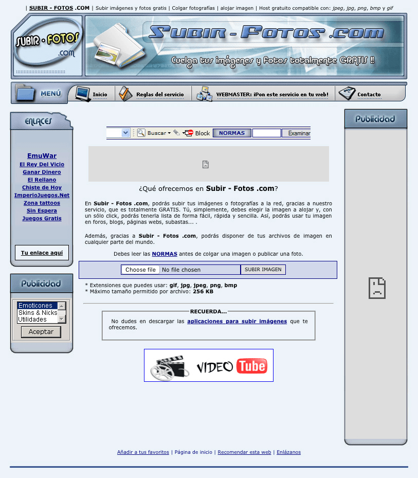 This was the first version of Subir-Fotos.com ("upload-photos.com" in English), a website I created in 2006, when I was fifteen, to allow users to upload pictures and share them online (back then, image hosting services were not as common as they are today, so there was a real need for this kind of service). This was also my first PHP website!