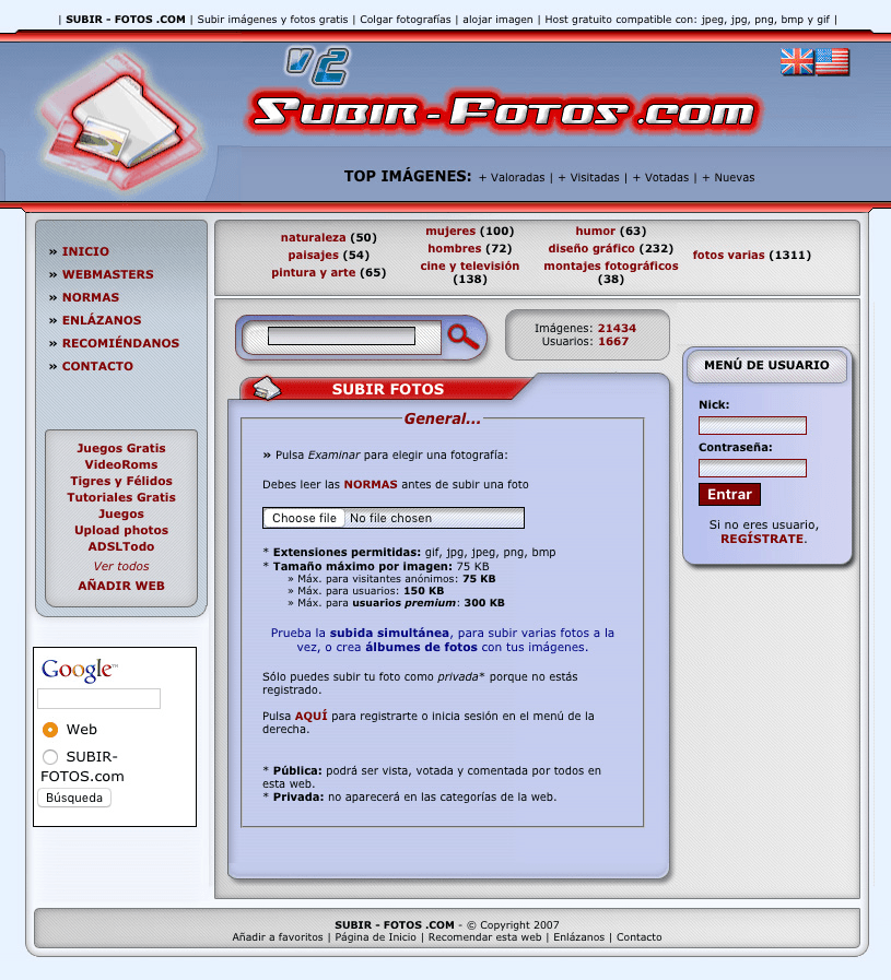 After the success of the first version of Subir-Fotos.com ("upload-photos.com" in English), I decided to create a second version that would add more features while keeping the core functionality of the original site.