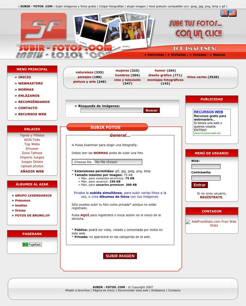 This was the third and final version of Subir-Fotos.com ("upload-photos.com" in English), building upon the original 2006 version and the 2007 update. It featured a refreshed design and continued to offer user accounts for managing and sharing pictures.